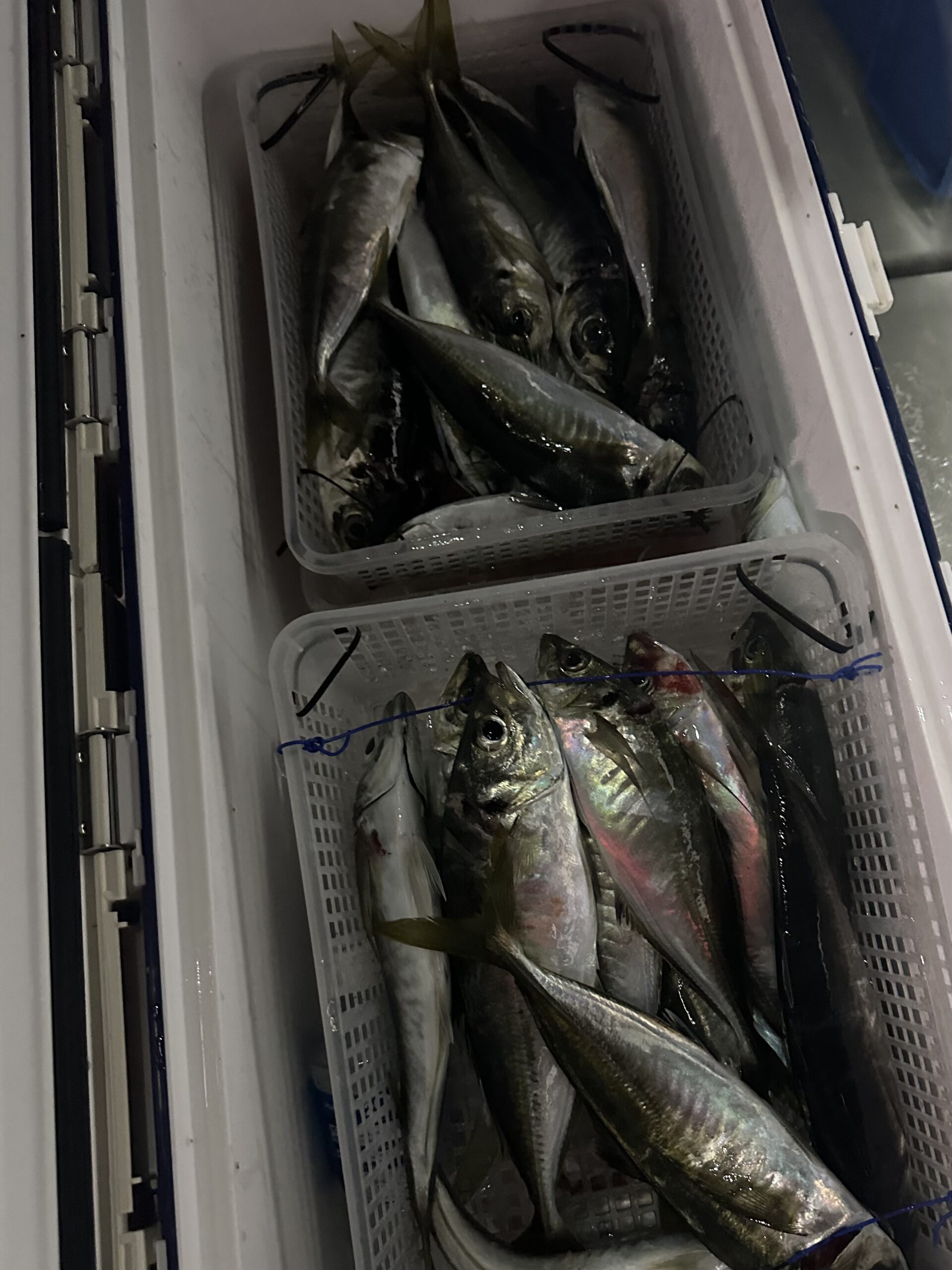 スルメイカ、シロイカ マアジ 明るい時間からスルメのダブルでスタート。今日もスルメが遊んでくれるかなと期待しますが、点灯後は単発ヒットで増えません。シロイカも単発ヒット。暴れん坊将軍サバの被害は軽かったのでアジは釣りやすかったです。多い人30匹以上。しかしイカの釣果が悪くパッとしない夜でした。 |