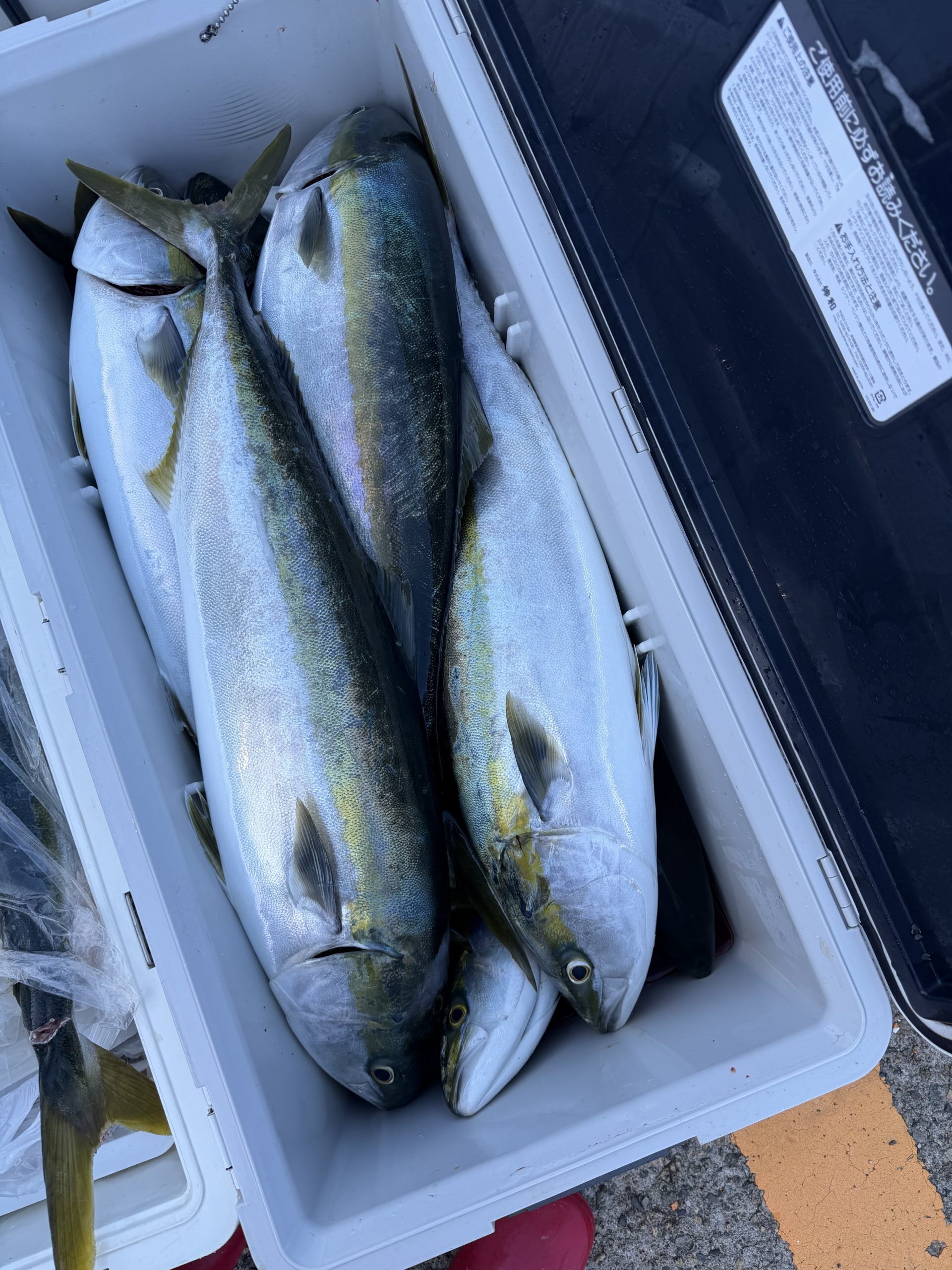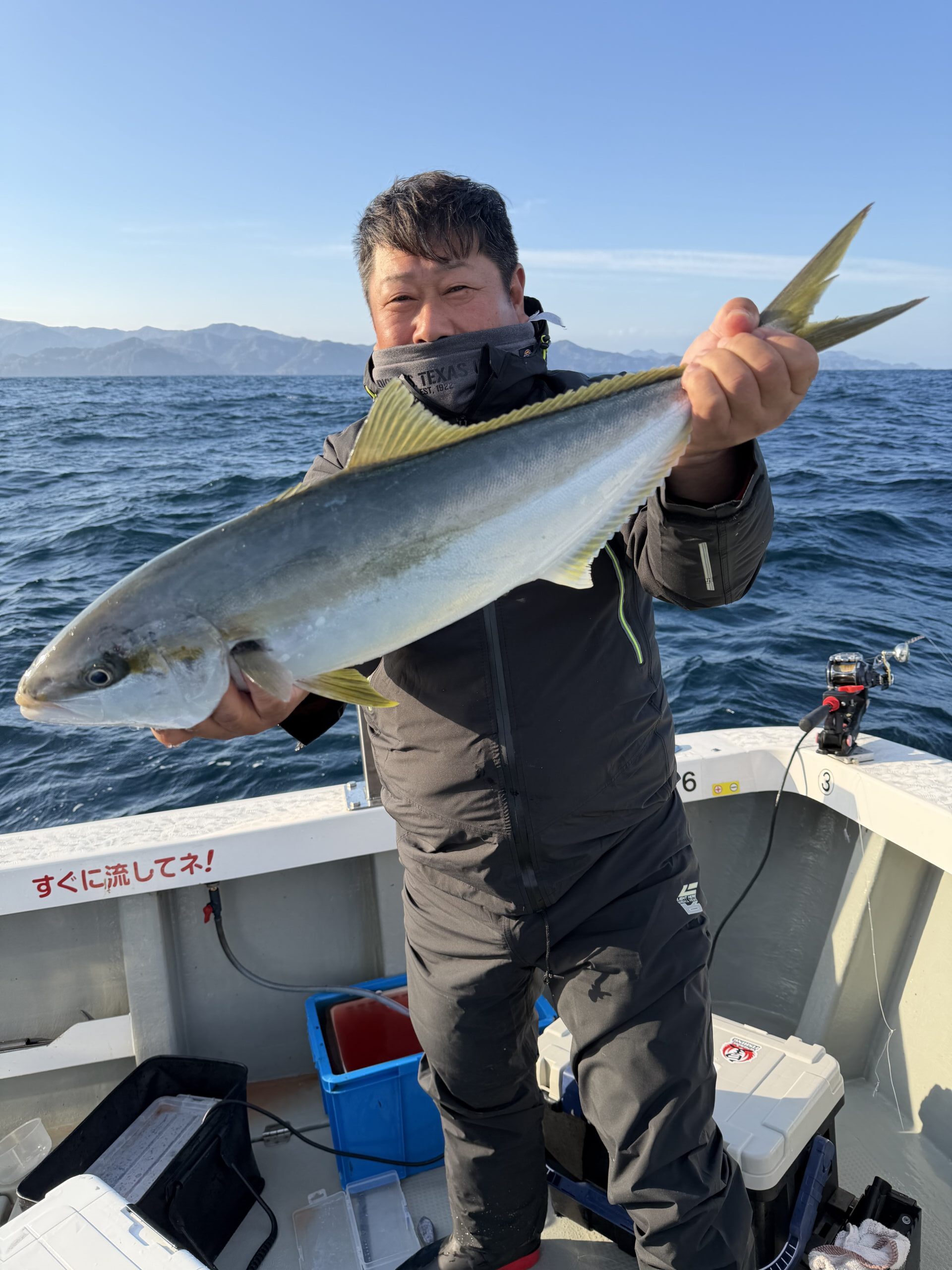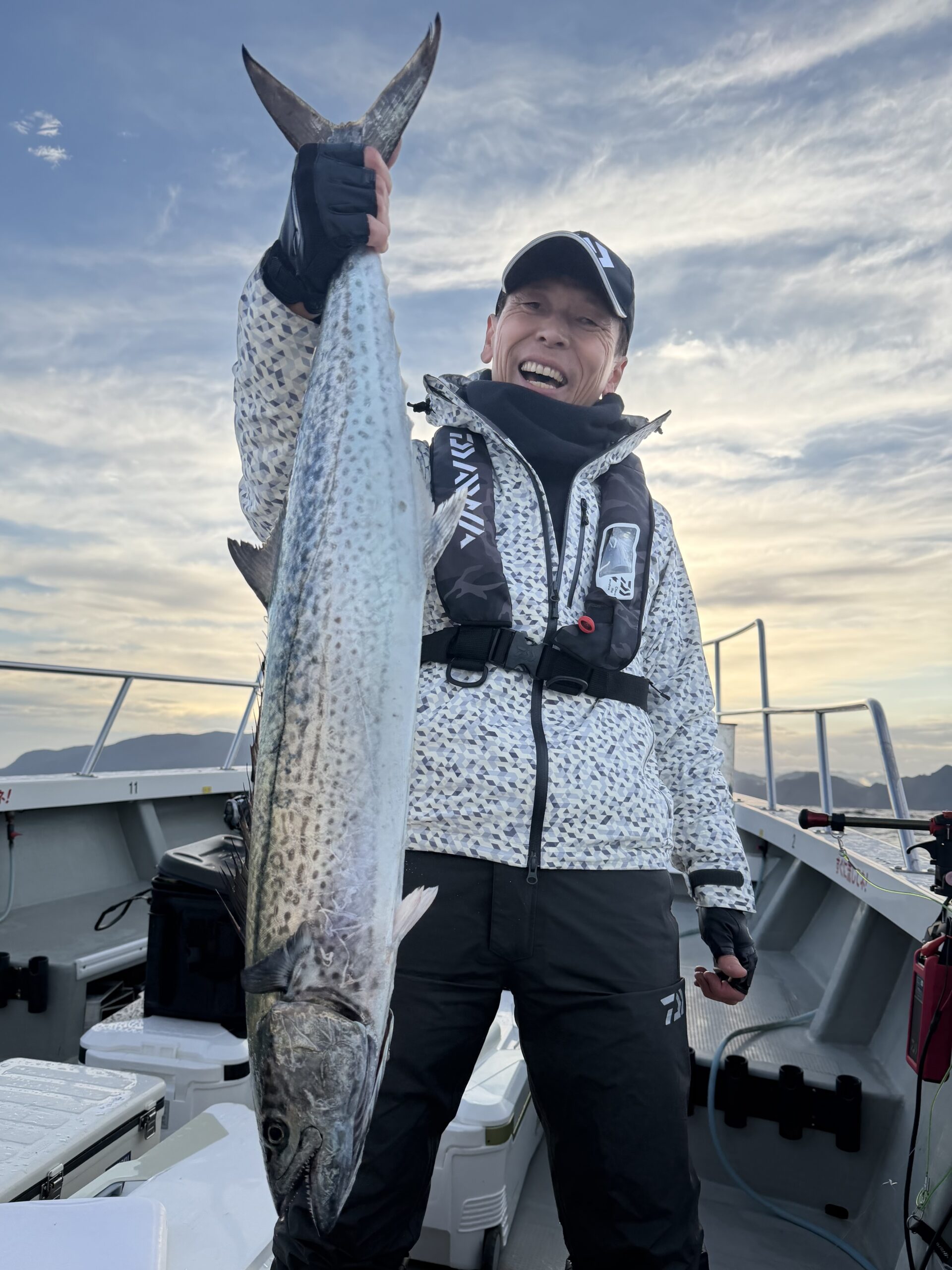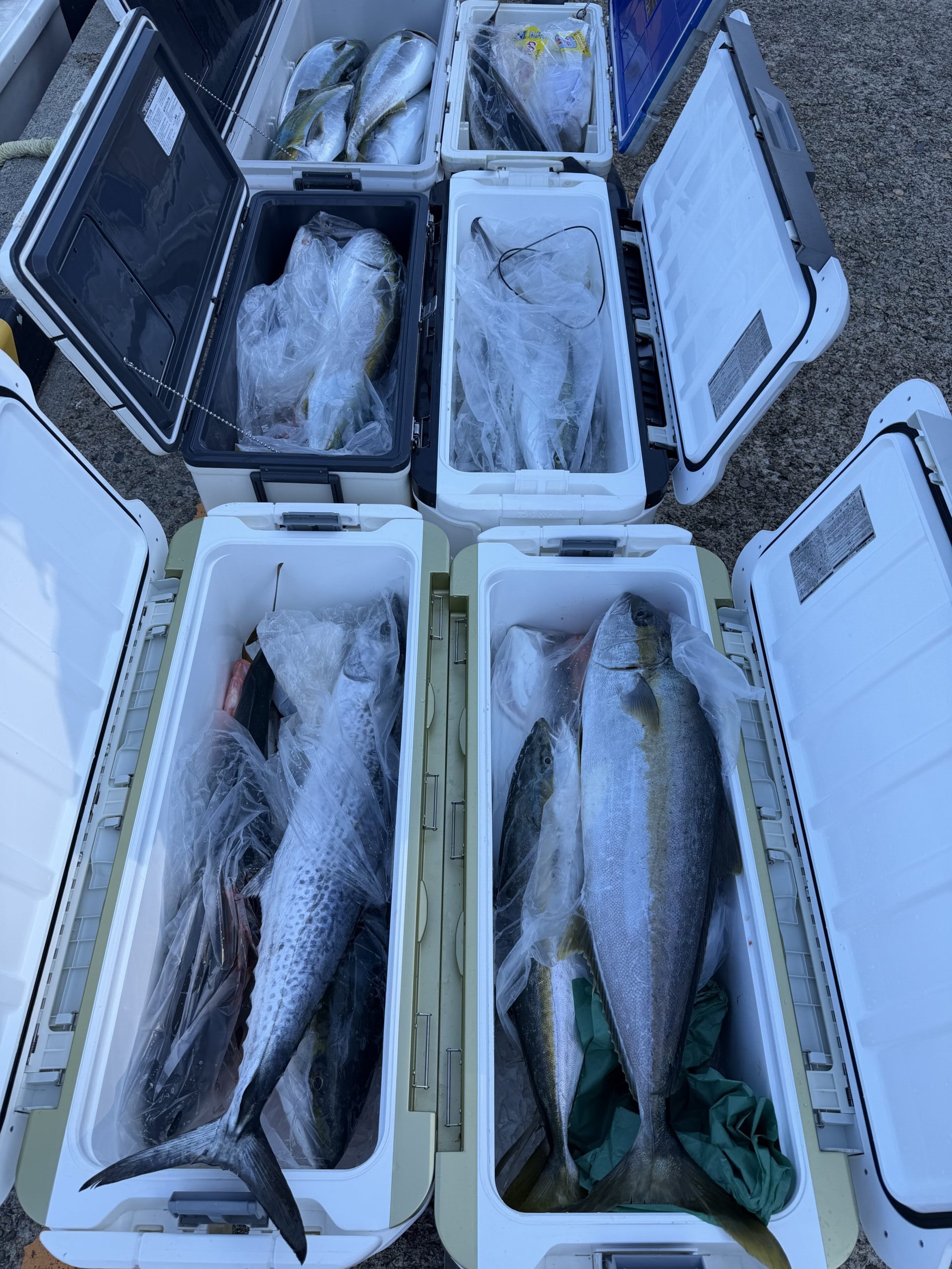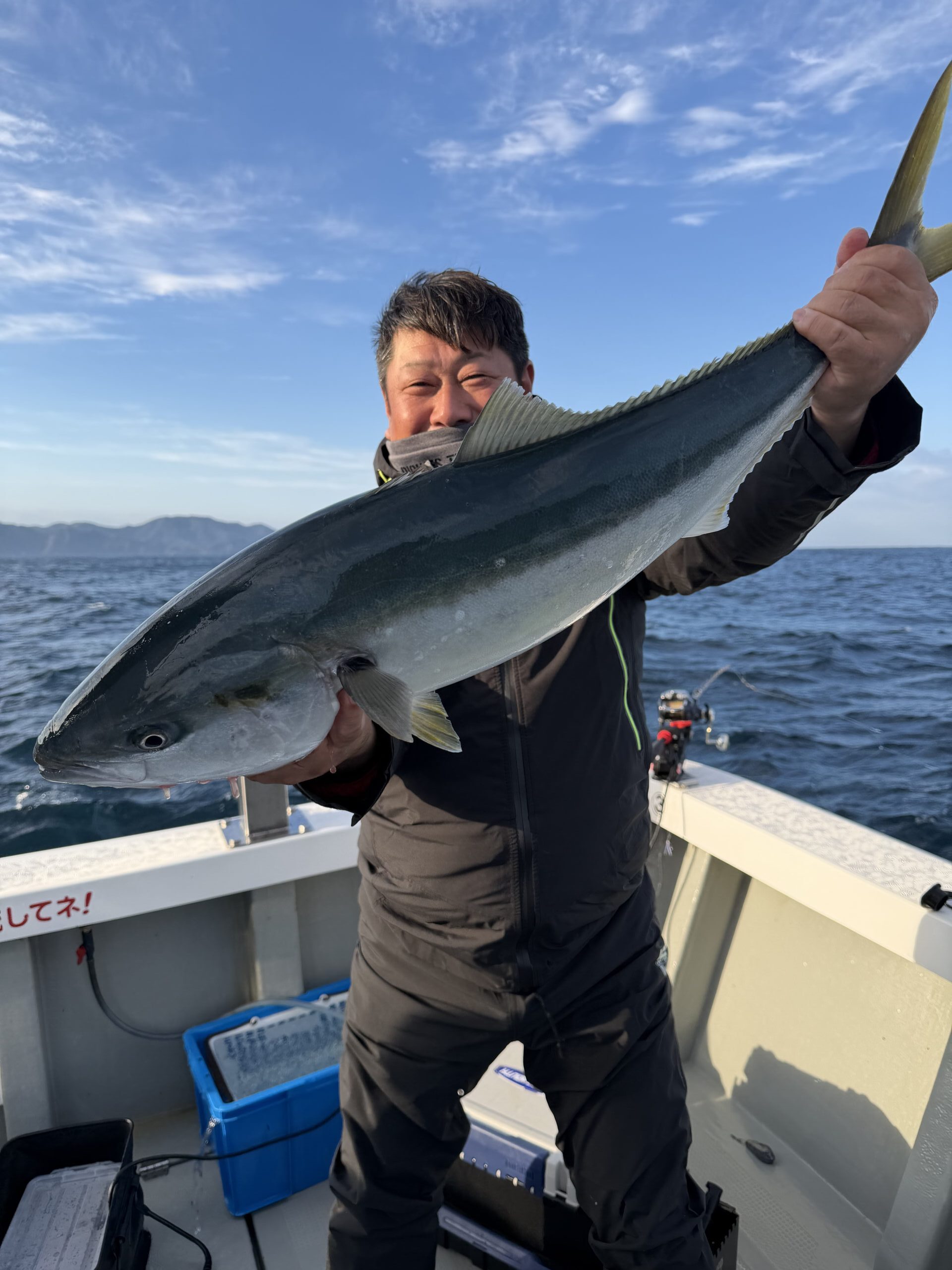 ブリ、メジロ 、ハマチ 24匹 ヒラマサ 2匹 サワラ 2匹 アコウ 2匹 ガシラ 2匹 今日も西方面へ。イワシ感度は直ぐに見つかりました。しかし潮なしでイワシになかなか喰い付きません。辛抱しているとズドンと来ます。10時頃からペースが上がり頻繁に竿が曲がりました。青物お腹いっぱいで漁礁周りを狙ってジャンボアコウGET。竿頭の大森氏、ほとんどブリサイズを11本GETでクーラー入らずでした。ブラボー。 |