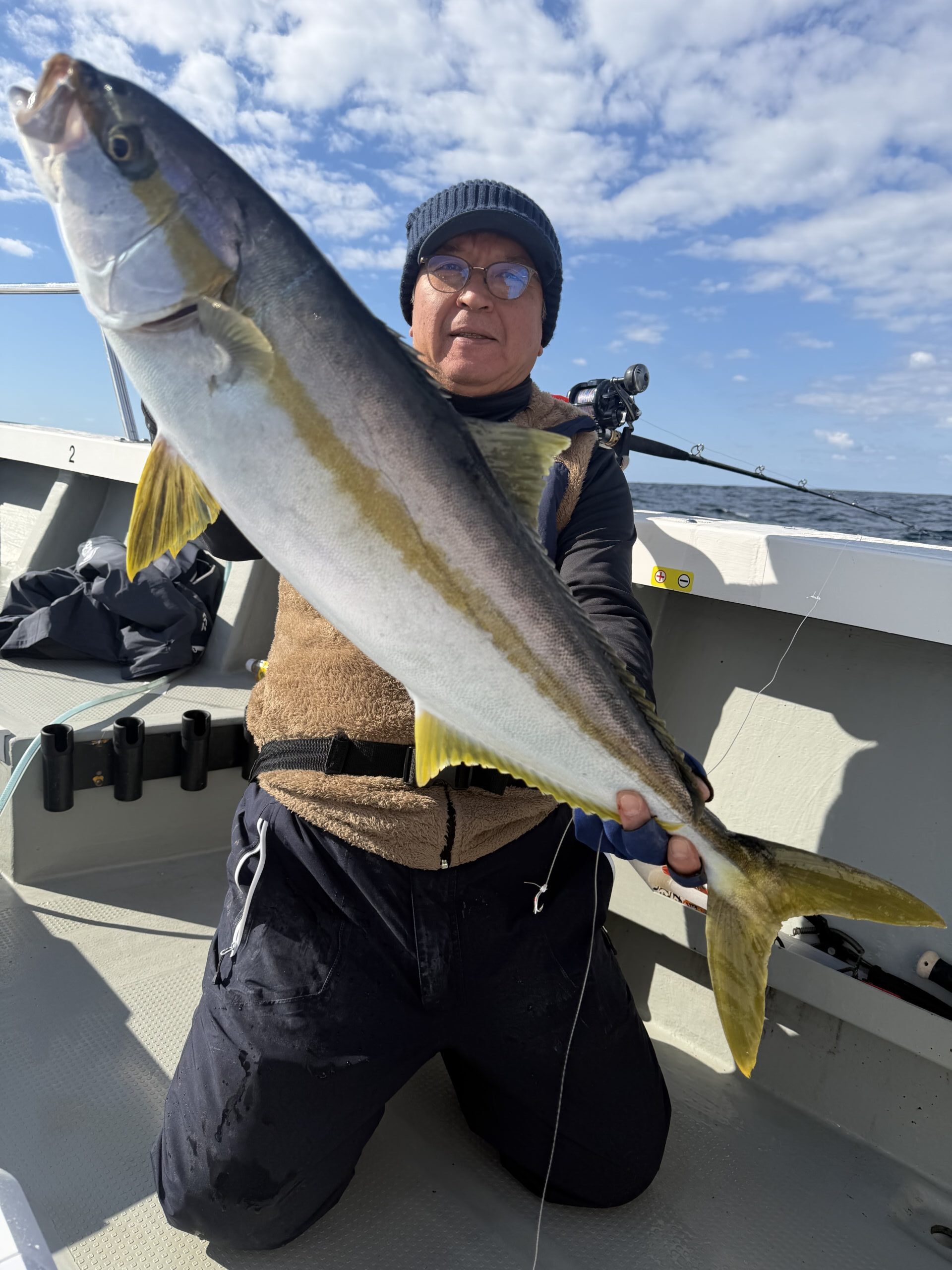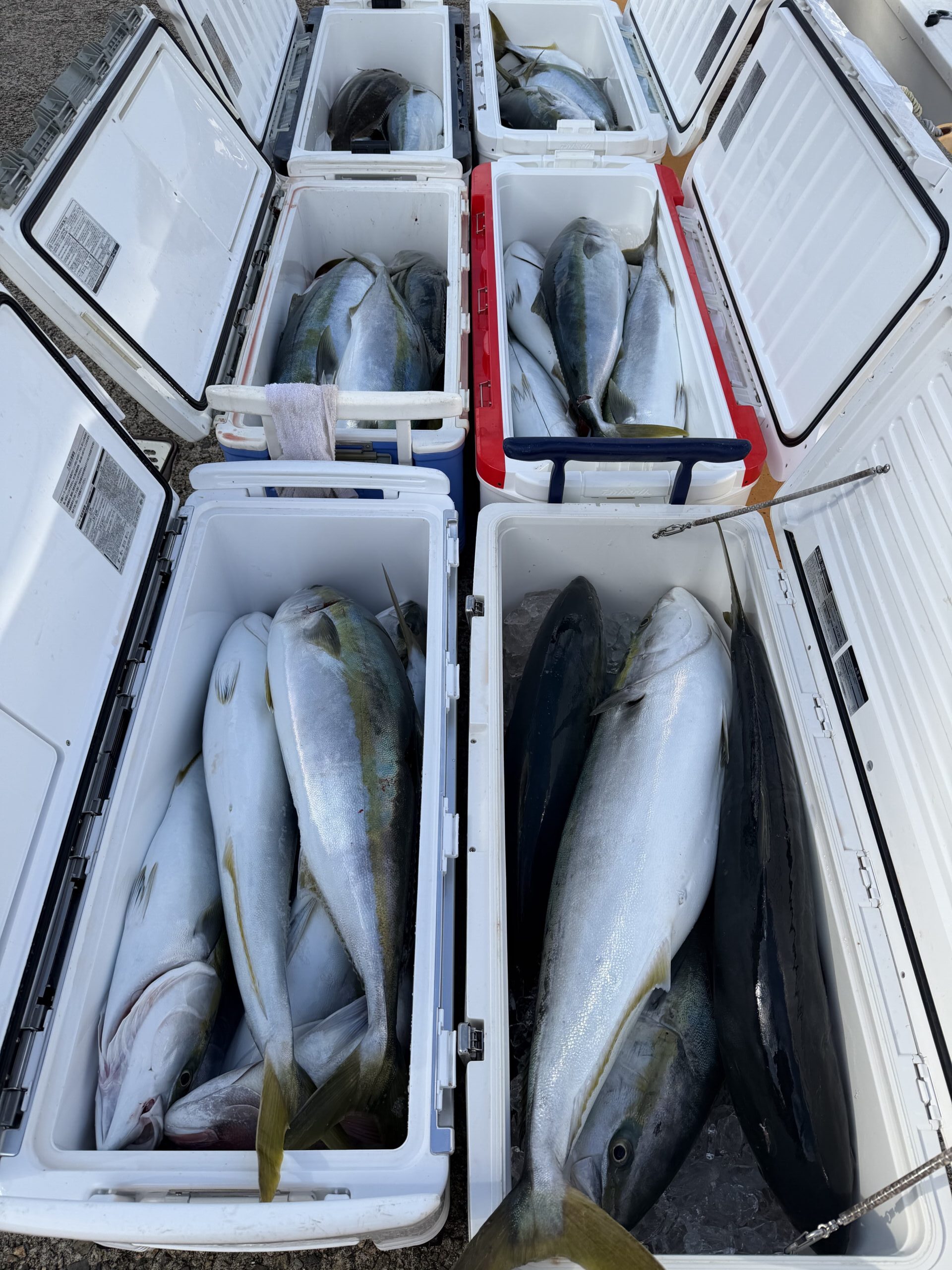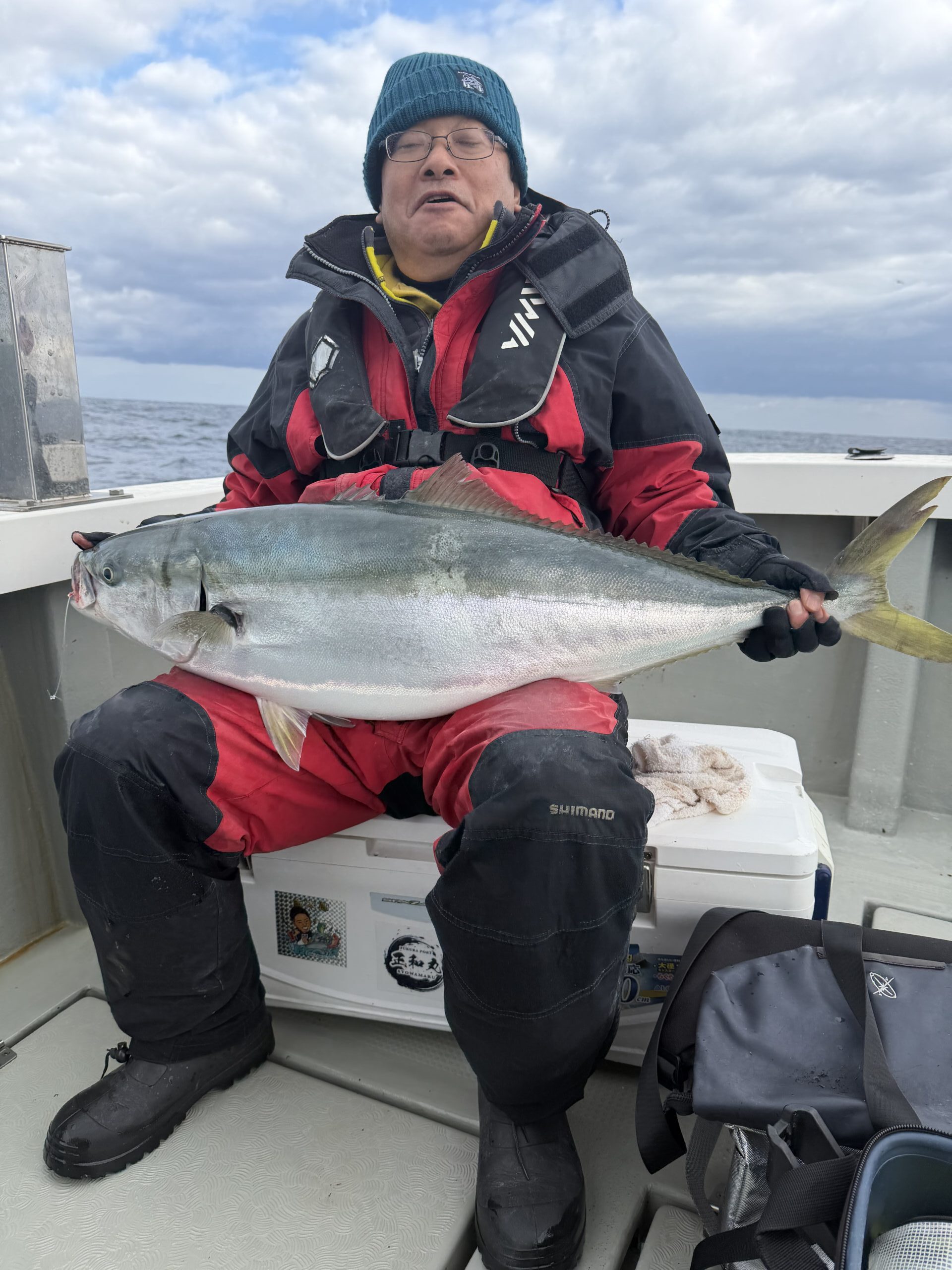 ブリ、メジロ、ハマチ 30匹以上 ヒラマサ 1匹 ヒラメ 1匹 マダイ 1匹 西へ直行。今日はイワシ少ないのかなーと思いましたがノープロブレム。時間を追うごとにイワシ感度がてんこ盛りでした。今日は魚種が少ないものの青物の型が良かったです。12Kオーバーの寒ブリが一本。エンドレスの喰いっぷりでしたが、みなさんお土産充分で早仕舞いでした。 |