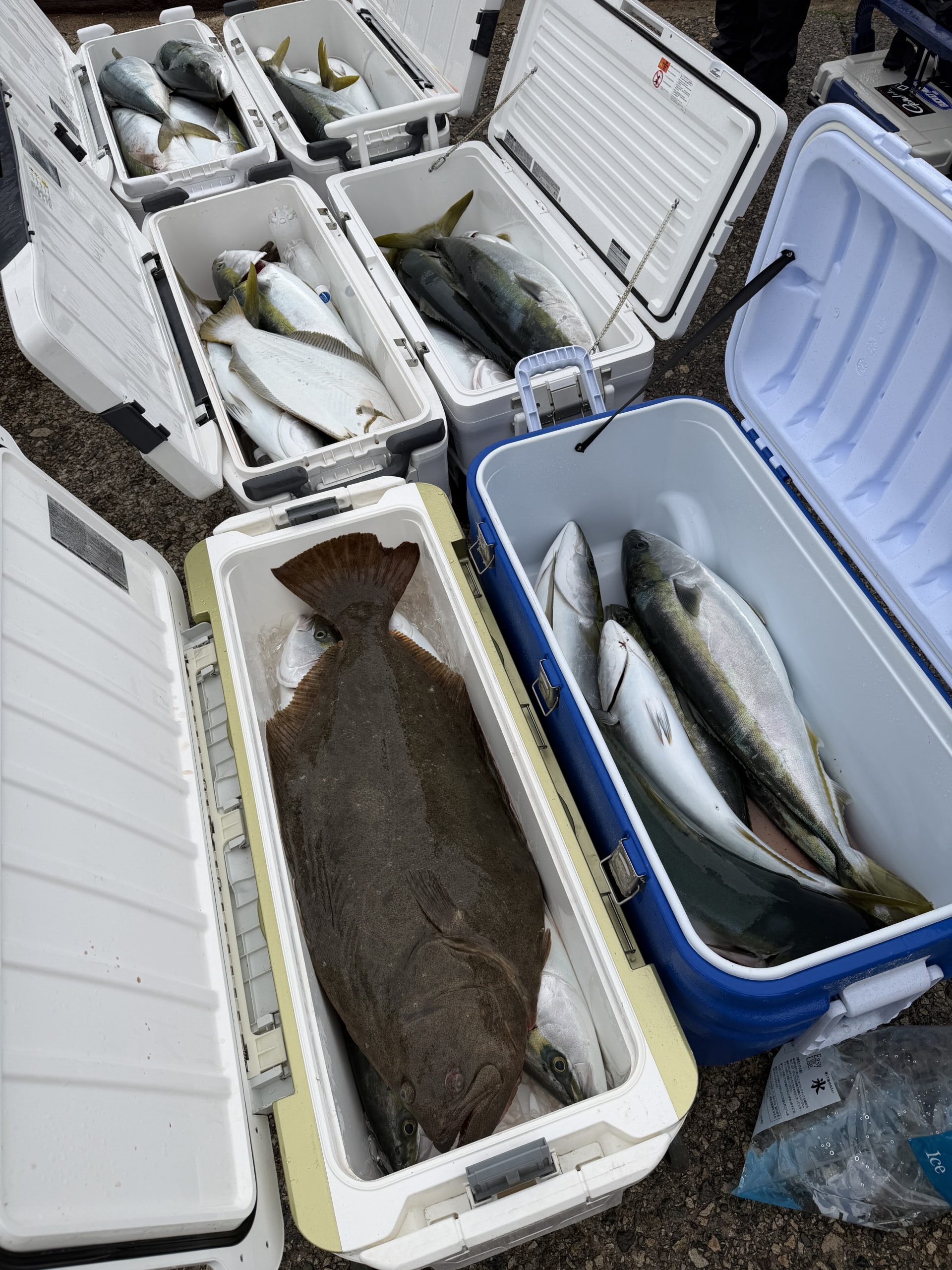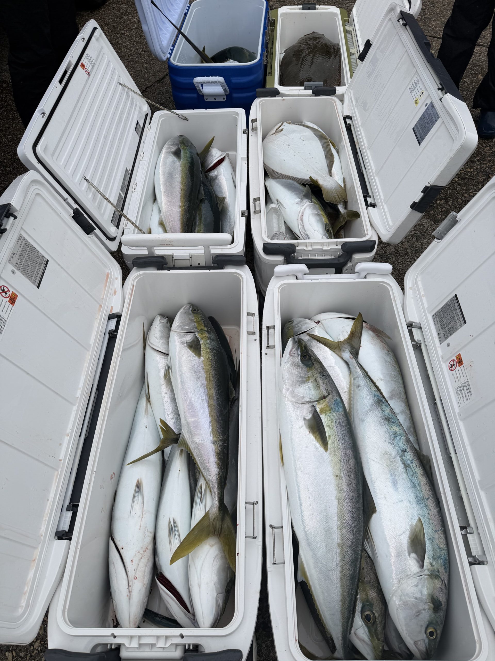 ブリ、メジロ、ハマチ 40匹以上 ヒラメ 3匹 三日間休船。昨日好調だったようで期待に胸を躍らせて出船。近場からイワシ感度たっぷりで順調に竿が曲がり始めます。小休止の時間もありましたが、納竿まで退屈なしに遊べました。座布団ヒラメ96cm8Kオーバー、良型ヒラメ、青物は竿頭10本以上で大型クーラー入らず。今日もみなさん笑顔満開の大満足でした。 |